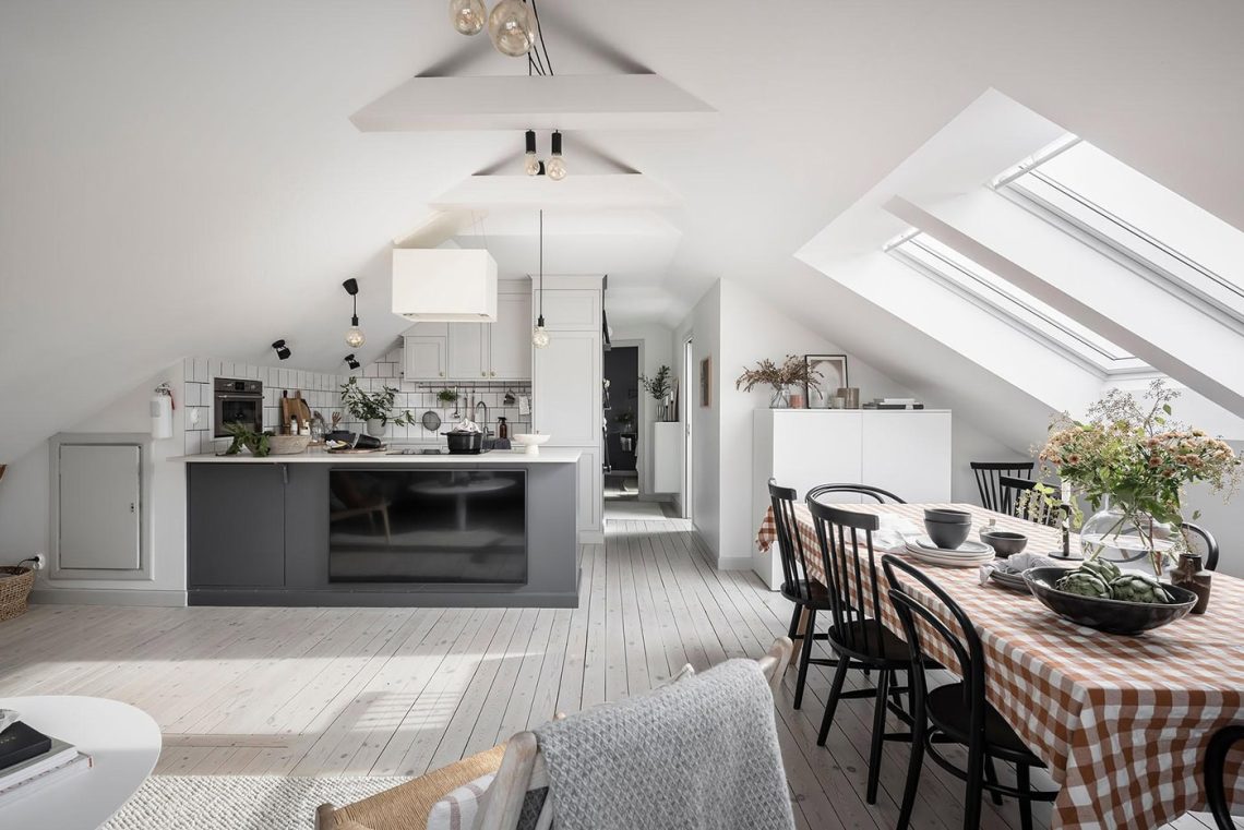 This light-flooded attic apartment (photographed by Anders Bergstedt for Alvhem) features an open floor plan, making it the perfect home for a small family. From the living kitchen to the cozy blue bedroom, this space is bursting with potential. The graceful, sloped ceilings give each room a spacious feel and a character all its own.